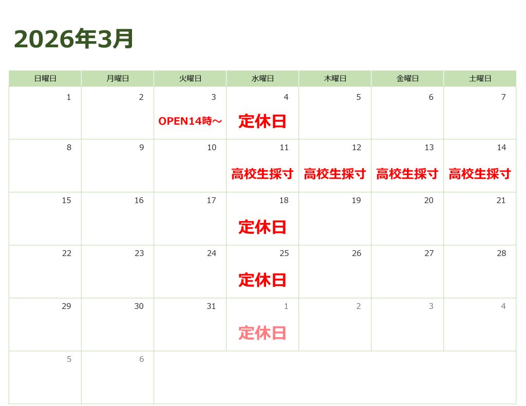 【稲荷前店】3月営業カレンダー | 学生服のつちや